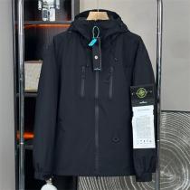 STONE ISLAND ジャケットはブラックカラーで、ジップアップフロントと調整可能なフードが実用的な要素を強調しています。フロントにはダブルジッパーポケットが配置され、収納力も抜群です。軽量で動きやすく、アウトドアや日常のカジュアルスタイルに最適なジャケットです。ストーンアイランド ジャケット